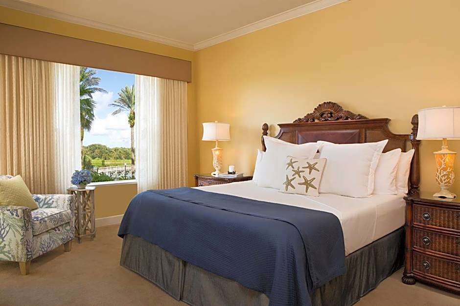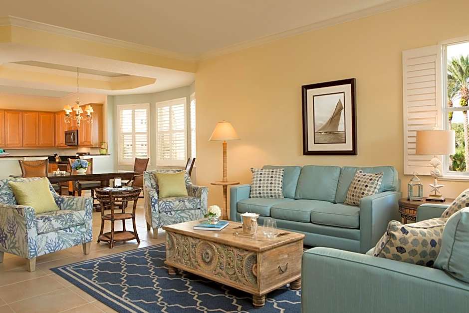 With lush, tropical golf and marsh views - our two bedroom villas are a short jaunt from the main resort building allowing you to take advantage of all of our amenities easily, but also offering a touch more privacy for those who don't want to be in the middle of it all. The Villas offer all the comforts of home, the amenities of a luxury resort, and privacy you can't find in a large hotel. It's like a beach condo vacation, but with the service of a AAA Four Diamond resort. Each villa unit offers spacious accommodations with separate bedrooms featuring either king, queen, or two twin sized beds. Televisions are standard in the living room and each bedroom, offering plenty of TV viewing options for the whole family. Enjoy all of the comforts of home with two full bathrooms, open living room, laundry room, a fully equipped kitchen and balcony overlooking the Ocean Course and tropical preserves. These suites feature: -King, Queen and/or Twin bedding -Eat-in, full sized kitchen with granite countertops and built-in appliances, including microwave -Tiled kitchen and bathrooms -Separate dining area large enough to accommodate 4 to 6 guests -Master bath with dual vanities, large garden tub, and walk-in shower -Additional full bathroom with stone counters -Laundry Room with washer and dryer -Open-air covered balcony with table and chairs -Cable television(s) with DVD player(s) -Telephone(s) -In-room safe for all of your valuables -Complimentary parking near your unit
